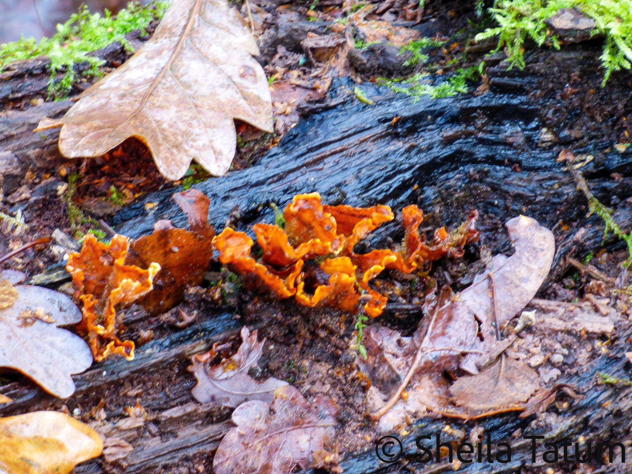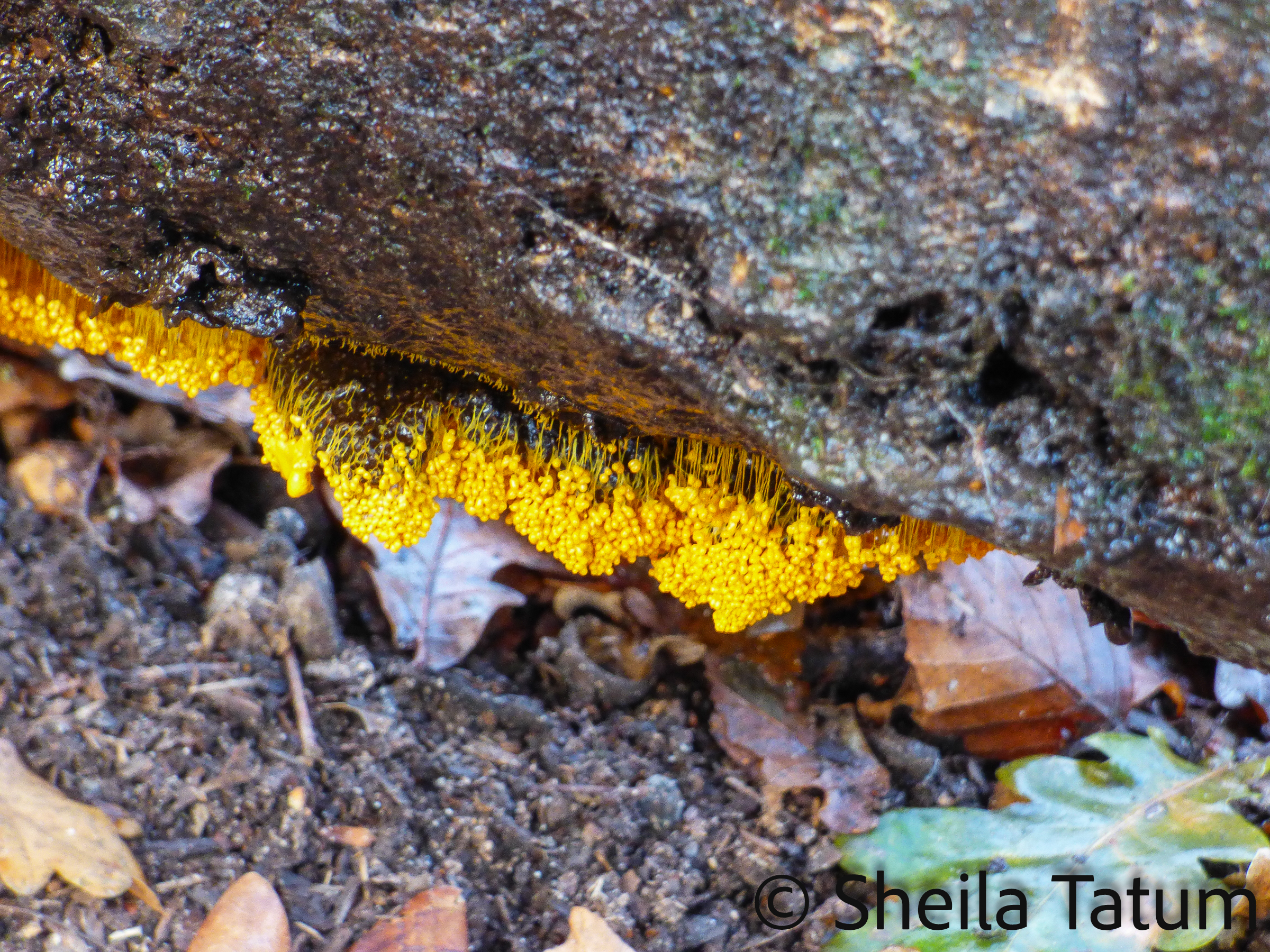 Sadly, I can’t identify the fungus in the pictures. The fungus growing on the underside of a dead branch is a rather spectacular orange does appear to be growing upside down and was apparently quite slimy.